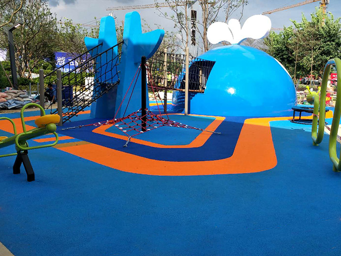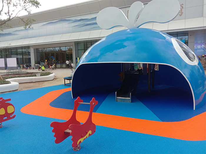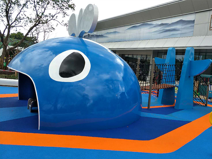 • 广西贺州碧桂园项目是一个以鲸鱼为原型而设计的游乐设备项目,整个项目充满了海洋气息,设置了跷跷板、摇摇乐、滑梯、爬网等游乐设备。