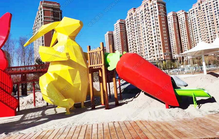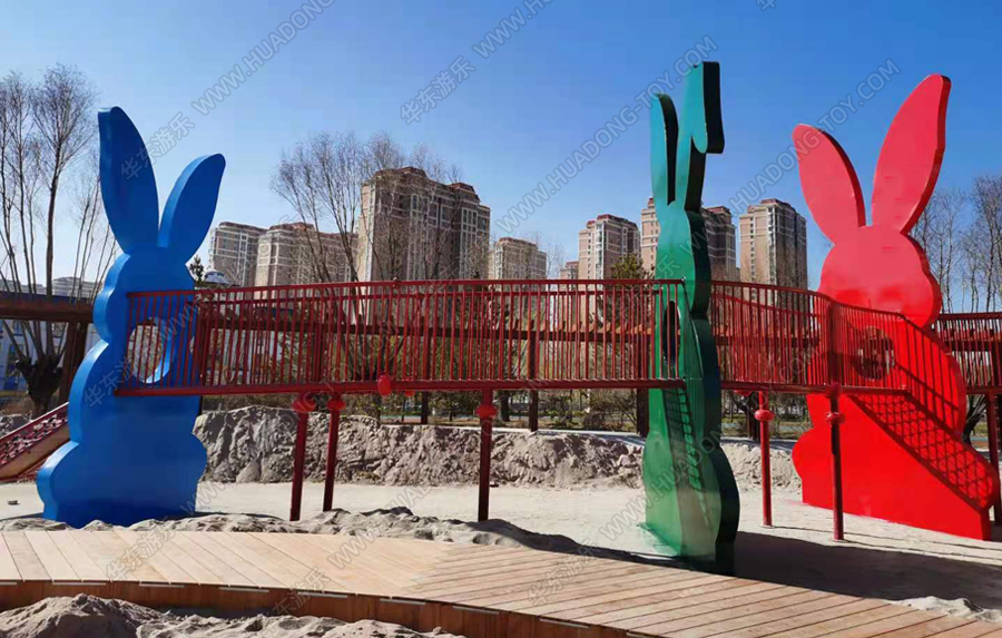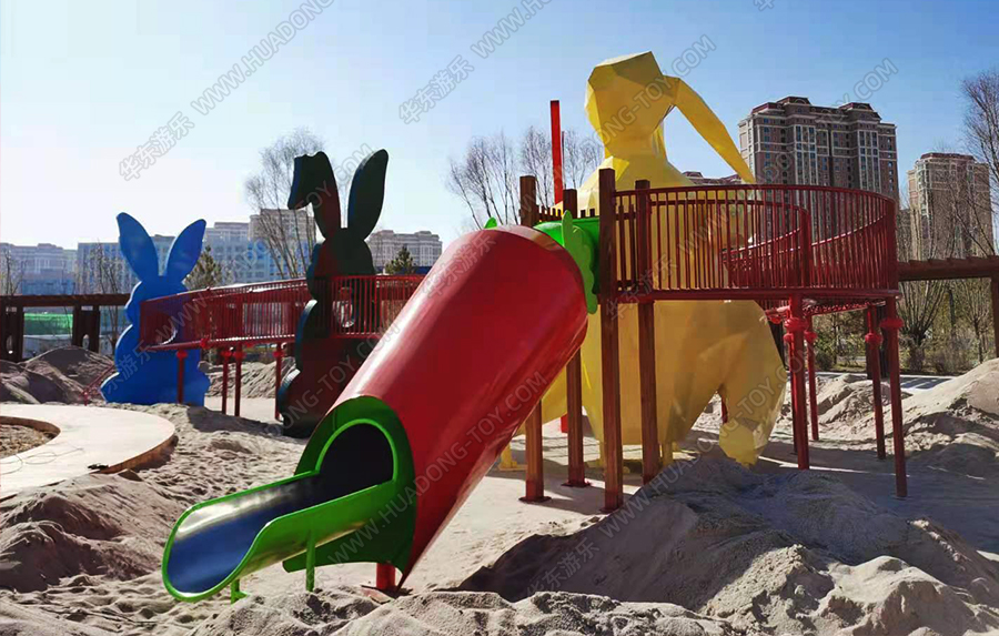 兔子乐园非标定制是乐鱼LEYU游乐根据客户场地需求以及结合当地实际情况而设计的兔子主题乐园的游乐场,该游乐园具有主题鲜明,设计新颖,功能多样等特点,设计了滑梯组合、爬网、钻洞、沙池等游乐设备。
