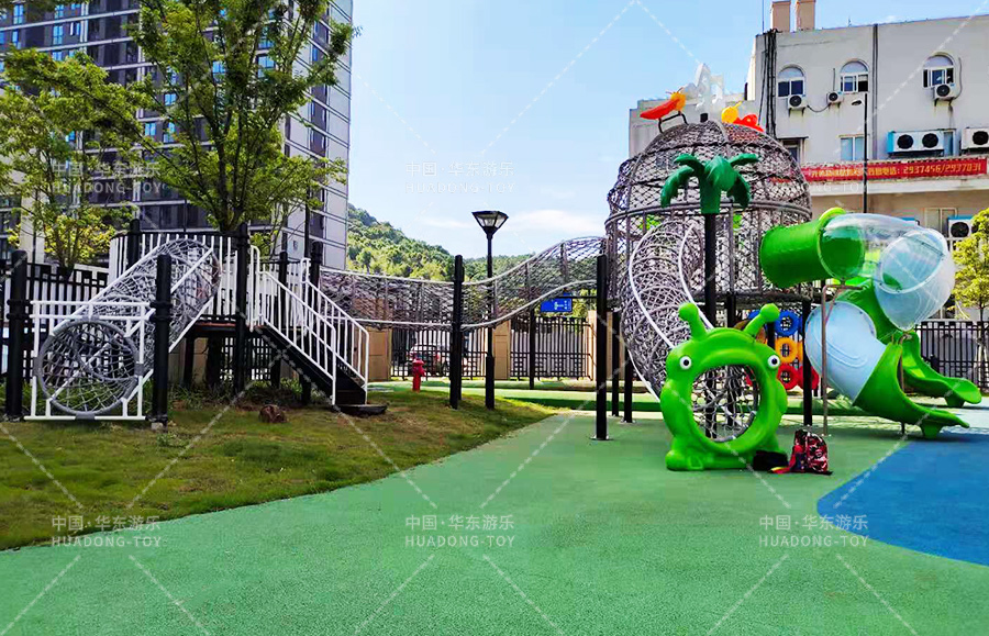 舟山市畚斗岙幼儿园此次选用的是又乐鱼LEYU游乐自主研发和设计的网绳系列户外滑梯组合,具备了爬网、钻洞、滑梯、滑桶、吊环、攀爬梯、沙池等游乐设备,能够让小朋友在玩耍中得到很好的锻炼和学习。